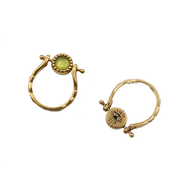 Cette bague est une pépite. À la fois mystérieuse et délicate, elle pivote pour révéler soit une pierre semi-précieuse apaisante, soit un œil gravé hypnotique. C’est un peu notre talisman, version stylée.