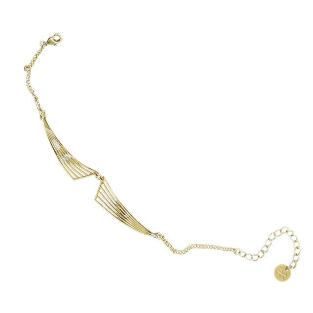 Une silhouette graphique, légère, pensée comme une architecture miniature autour du poignet. Ce bracelet en laiton doré à l’or fin 24 carats joue avec les volumes, les vides et la lumière. Deux formes triangulaires légèrement bombées, finement ajourées, s’articulent avec souplesse pour créer un bijou rigide mais mobile.