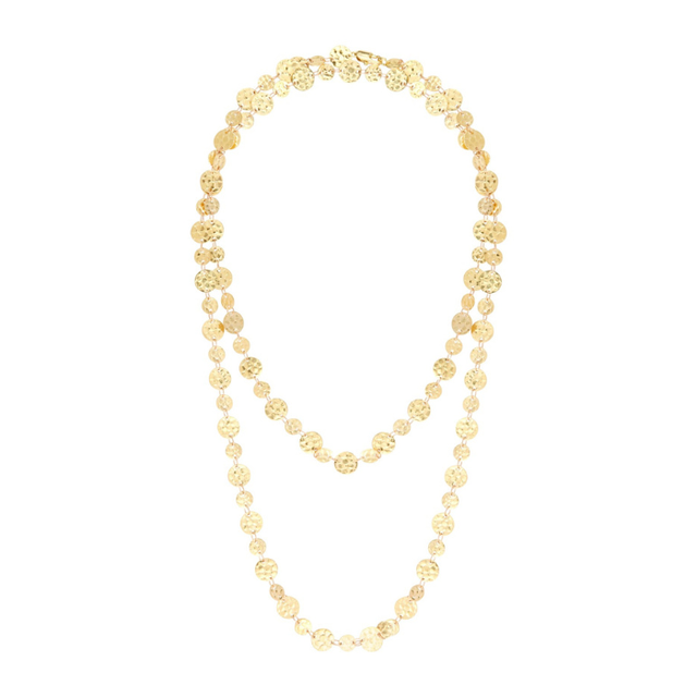 Ce collier en laiton doré à l’or fin 24 carats peut se porter en sautoir de 90 cm ou doublé en collier plus court, selon l’humeur. Les multiples pastilles martelées, légèrement différentes en taille et en relief, donnent un côté artisanal et graphique à ce bijou unique. Fabriqué à Lyon par la créatrice, il allie élégance et polyvalence pour accompagner tous nos looks.