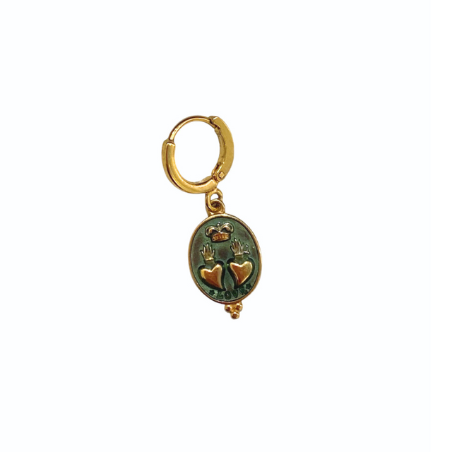 Sur une mini créole en laiton plaqué or, un médaillon suspendu dévoile un double cœur flamboyant, couronné et émaillé d’un bleu transparent intense. Et juste en dessous, un petit mot gravé pour sceller l’intention : "love".