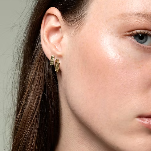 Deux rectangles, un léger décalage, et hop : le charme opère. Ces Puces Double Adama jouent la carte du relief avec leurs deux estampes martelées soudées à la main, dorées à l’or fin 24 carats. Un bijou à la fois minimal et affirmé, pile dans l’équilibre parfait entre design brut et raffinement. Entièrement réalisées à la main dans l’atelier parisien de la créatrice, elles sont uniques comme nous.