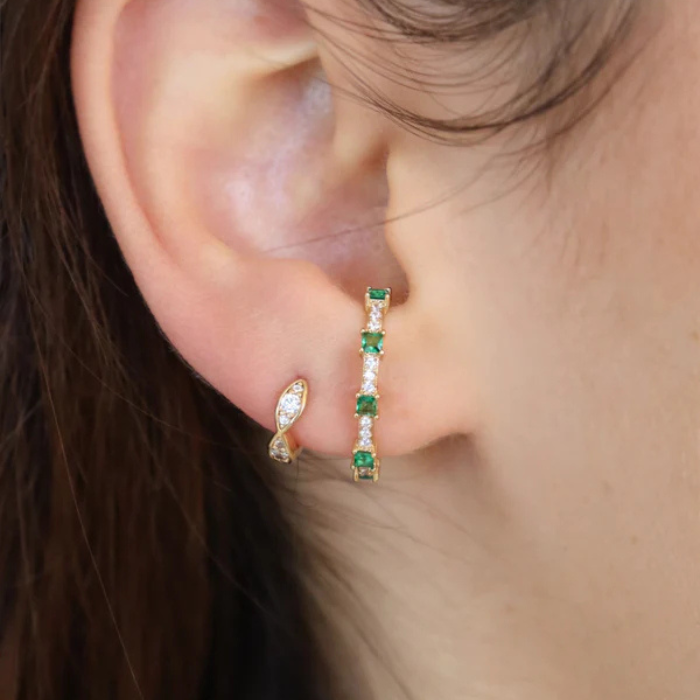 Sa tige courbée est entièrement sertie d’une rangée de zircons blancs, rythmée par cinq zircons verts émeraude placés tous les trois zircons blancs. Ce jeu d’alternance crée un contraste délicat, mais bien visible, qui donne du relief au bijou sans le surcharger.