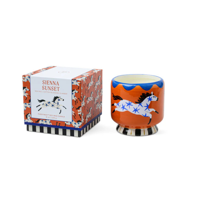 Cette bougie parfumée nous embarque pour un voyage sensoriel unique. Son pot en céramique orange, décoré à la main d’un cheval noir et blanc aux étoiles bleues, mixe design rétro et poésie. La fragrance, mélange subtil de sel de mer, fleur de coton et ambre, crée une ambiance douce et réconfortante. Livrée dans une jolie boîte, elle est parfaite pour offrir, et son contenant peut être réutilisé une fois la bougie terminée.