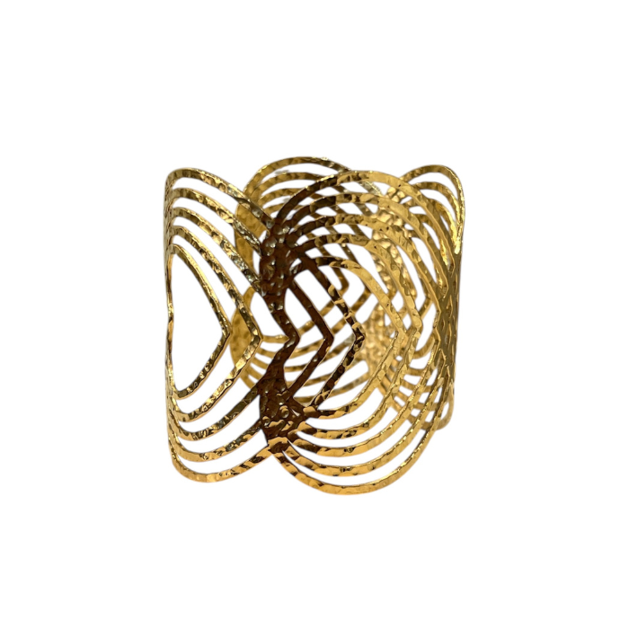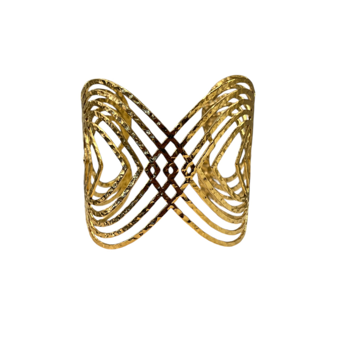 Le métal martelé donne du relief et accentue le jeu de lumière sur chaque courbe, l’effet sculptural du bracelet est ainsi renforcé. L’ensemble forme une superposition de cœurs soudés entre eux, comme une composition poétique qui habille le poignet avec caractère.