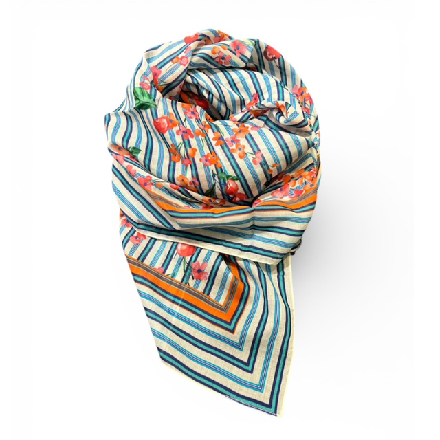 On aime ce format ample qui se noue de mille façons, ce coton doux et agréable sur la peau, et ce mélange de couleurs fraîches qui donne immédiatement bonne mine. Un carré qu’on adopte aussi bien autour du cou, dans les cheveux ou accroché à un sac, pour une note pop et solaire.