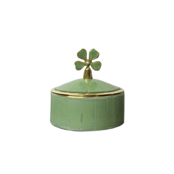 Cette boîte ronde en laiton recyclé c'est un design raffiné, une touche d’artisanat et un brin de chance avec son trèfle doré posé sur le couvercle. Les inclusions de résine verte sur ses cloisons ajoutent un joli contraste, tout en rappelant la nature. Parfaite pour y glisser quelques bijoux, clés ou petits trésors, elle se glisse aussi bien sur une coiffeuse que sur une étagère.