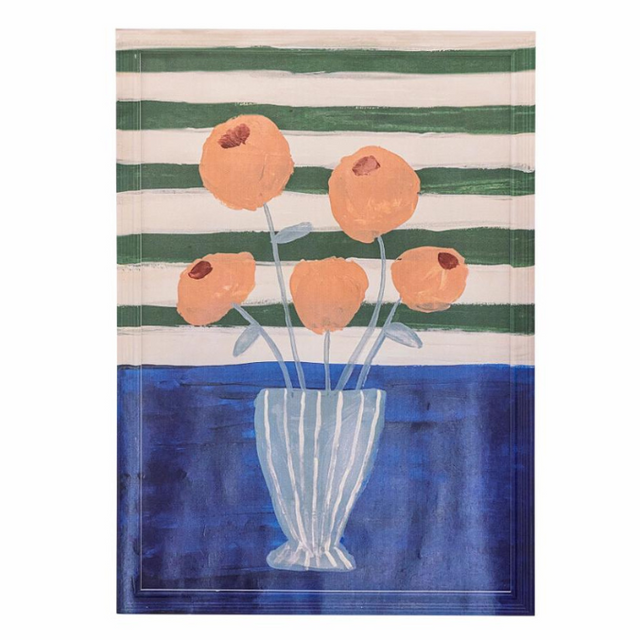 Fini les murs qui s’ennuient : avec ce grand tableau, on plante direct de la couleur et du style dans la pièce. Entre ses rayures kaki-crème, sa base bleu marine et ce vase bleu rayé qui balance cinq fleurs corail, il transforme notre mur en scène arty. Et le petit bonus qui change tout ? Le motif déborde jusque sur le cadre. Oui, carrément.