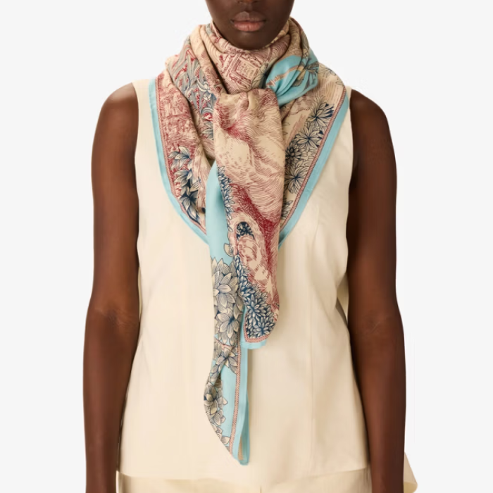 Un foulard que l'on noue autour du cou, que l'on porte en jupe improvisée ou en top cache-cœur quand la silhouette demande une pièce plus expressive. Ce grand carré dévoile un décor foisonnant inspiré des gravures anciennes : palais aux airs d’architecture romaine ou grecque, animaux qui traversent la scène et végétation qui reprend ses droits. Sur fond turquoise, les dessins rouille et écru se mêlent aux palmiers et aux feuillages bleu. Un motif si riche qu’on pourrait s’y perdre et découvrir de nouveaux détails à chaque regard.
