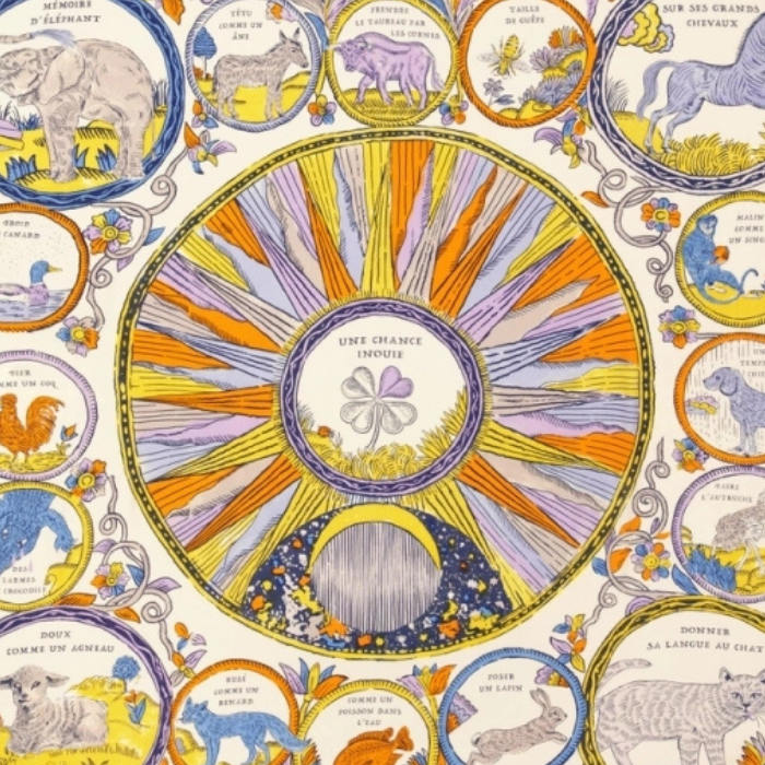 Notre foulard Chance, c’est plus qu’un accessoire : c’est une balade dans la langue française, version illustrée. Sur ses couleurs automnales réchauffées par un cadre bordeaux, on retrouve une multitude de petites bulles malicieuses, chacune mettant en scène nos expressions cultes. “Froid de canard”, “rusé comme un renard”, “comme un poisson dans l’eau”... chaque coin du foulard raconte une histoire, comme une gravure ancienne pleine d’esprit.