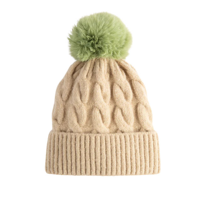 Grosse maille tressée et pompon en fausse fourrure vert sauge, il coche la case confort + style en un clin d’œil. Les tons vanille crémeux adoucissent nos looks d’hiver, et le détail sauge vient donner la petite note fraîche et inattendue.