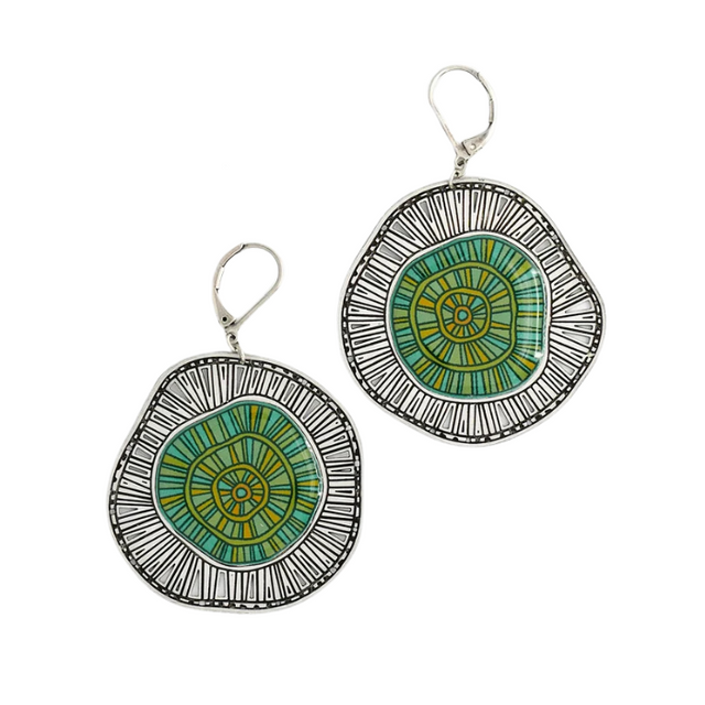 Des boucles comme des amulettes visuelles. Sculptées dans un laiton argenté patiné, ces boucles oversize sont de véritables paysages abstraits à porter. Chaque pièce est composée de deux éléments : une base ajourée à la géométrie irrégulière, striée et presque mouvante, et au centre, une inclusion d’image sous résine, dans des verts différents.