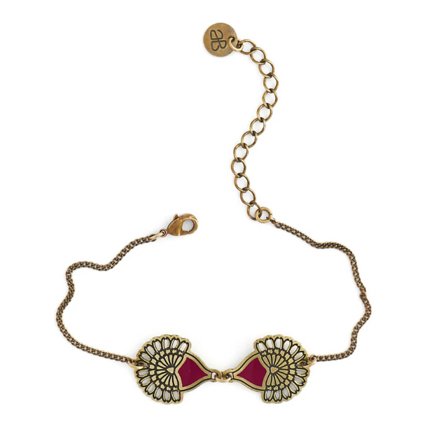Un bracelet qui mêle finesse et caractère, avec ses deux motifs graphiques découpés au laser reliés par un anneau discret. La structure en laiton finition vieux bronze se marie parfaitement avec l’intensité de la résine bordeaux, pour un contraste maîtrisé et tout en relief.