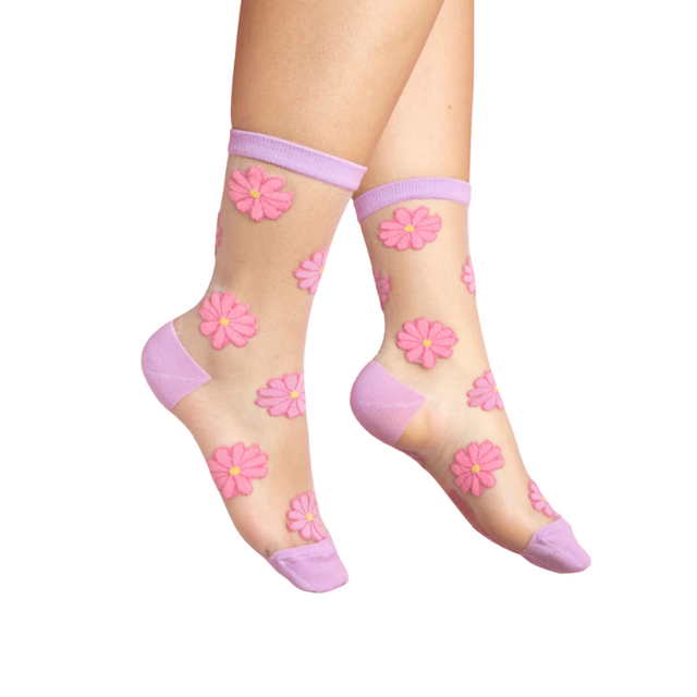 Les cosmos débarquent en force sur ces chaussettes transparentes, avec leurs pétales délicats en dégradés de rose et de mauve. L’effet est aérien, léger, et furieusement poétique.Un modèle parfait pour semer un peu de magie florale dans notre quotidien et réveiller les abeilles en mode fashion week.