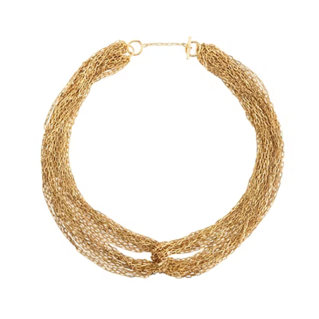 C’est lui qui donne le ton dès qu’on le met. Ce collier c’est un enchevêtrement doré & chic, ultra vivant : plusieurs chaînes qui se croisent, s’entremêlent et se rejoignent au centre, comme un petit tourbillon d’énergie. Plaqué or, brillant et façonné à la main dans l’atelier parisien de la créatrice, il épouse le cou avec allure et confiance.