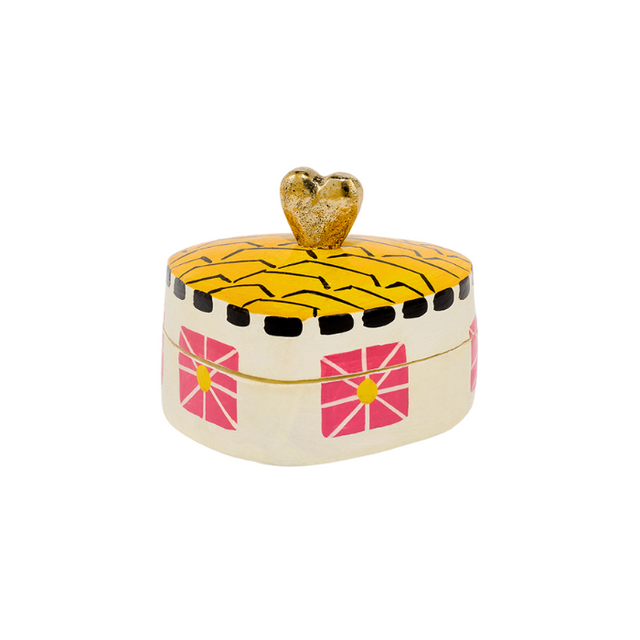 On craque pour cette petite boîte en forme de cœur, 100 % faite main en Inde à partir de papier recyclé et surmontée d’un cœur doré en laiton recyclé. Un concentré de fantaisie, de couleurs vives et de poésie artisanale.