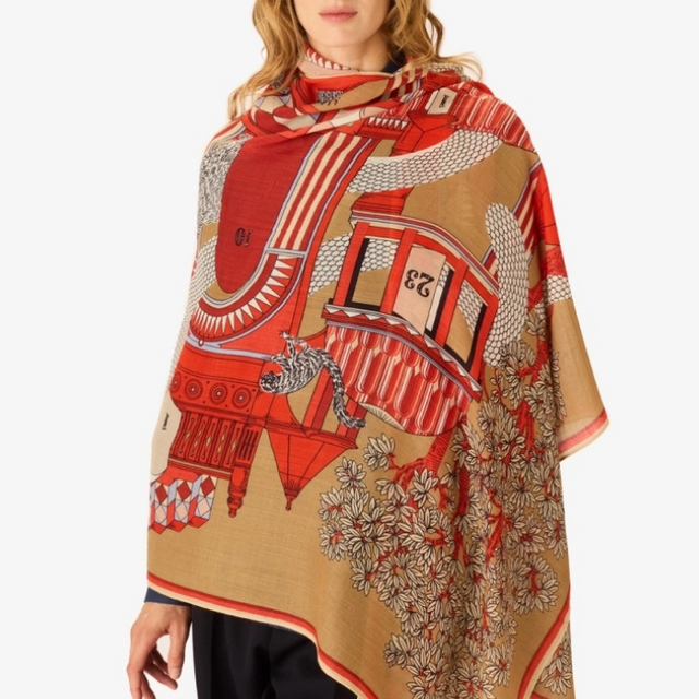 Sur un grand fond sable, cette écharpe en laine nous plonge dans une scène magique : une bâtisse détaillée façon gravure, des fenêtres numérotées comme un calendrier de l’Avent… mais ici, pas de chocolats ! À la place, un léopard et un tigre s’échappent des ouvertures, un serpent s’enroule autour des murs et une chouette veille dans les hauteurs. Le tout dans des nuances rouge et beige, imprimé main en Inde, pour un effet féerique et surprenant.