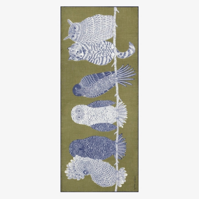 Cette étole, c’est un peu comme une balade en forêt d’hiver qu’on emporte partout avec nous. Tissée en laine toute douce et imprimée à la main en Inde, elle joue la carte du mystère : sur son fond kaki se posent cinq chouettes finement dessinées, et si on regarde de plus près… un chat s’invite dans la scène, comme un secret bien gardé. Graphisme façon gravure, détails délicats en marine et blanc : une étole qui réchauffe autant le cou que l’imaginaire.