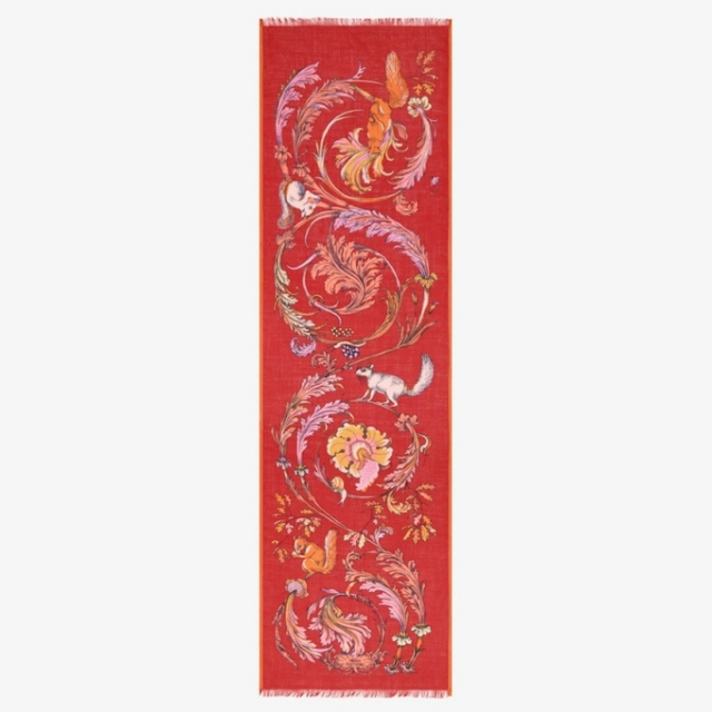 Sur fond rouge intense, l’étole Rococo déploie son petit théâtre végétal : fleurs, feuilles, escargots cachés et écureuils curieux. Les tons automnaux se posent comme des coups de pinceau et le fin liseré orange vient tout encadrer avec style. Une étole en 100% laine, chaude et douce, qui fait l’unanimité, peu importe le look ou le genre.
