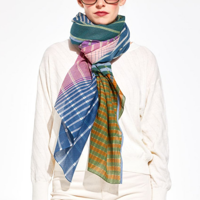 On adopte sans hésiter ce foulard en coton, imprimé au cadre pour un rendu éclatant. Son motif signature mélange les teintes avec justesse pour un effet graphique et lumineux. Avec ses bordures tissées qui renforcent le contraste des couleurs, il ponctue notre tenue.
