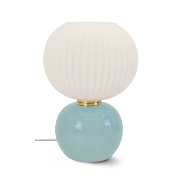 Son design ? Deux boules superposées : une boule en verre opaque délicatement striée et une base en verre lisse teinté d’un bleu ciel hyper lumineux. Entre les deux, des anneaux en laiton qui ajoutent juste ce qu’il faut de chic.