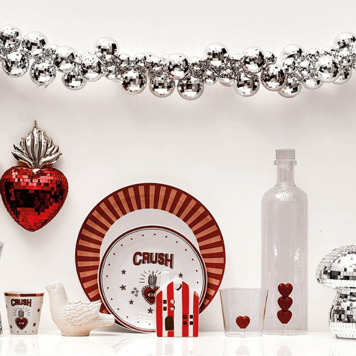 Un cœur qui en met plein la vue ! Version revisitée de la mythique boule à facettes, ce cœur rouge façon ex-voto mêle nostalgie, éclat et clin d’œil rétro. À suspendre ou à poser, il attire et renvoie la lumière comme un souvenir disco et transforme nos pièces en scène pleine de charme et de reflets rouge et dorés.
