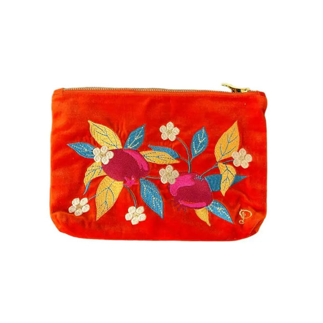 This embroidered velvet pencil case is as pretty to look at as it is soft to touch. Embroideries representing brightly colored tangerines delicately punctuate the orange velvet.