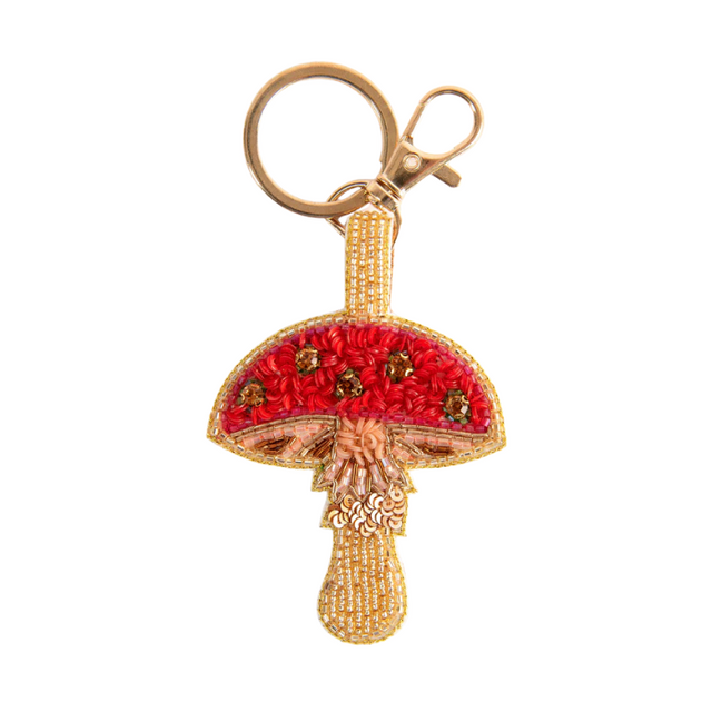 Ce champignon rouge n’est pas qu’un motif : c’est un concentré de fantaisie et d’artisanat ! Les perles rouges et dorées appliquées à la main lui donnent un côté précieux et joyeux, idéal pour illuminer nos clés ou notre sac.