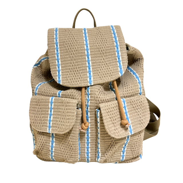 Envie d’un sac à dos qui sort du lot ? On craque pour ce modèle en tissage façon macramé, dans un beige sable doux et texturé. Ses motifs losanges, ses rayures contrastantes bleu ciel et blanc cassé, et son volume bien pensé font de lui le compagnon parfait pour nos journées nomades. Ultra pratique avec ses poches aimantées sur le devant, ses compartiments intérieurs, et ses bretelles réglables.