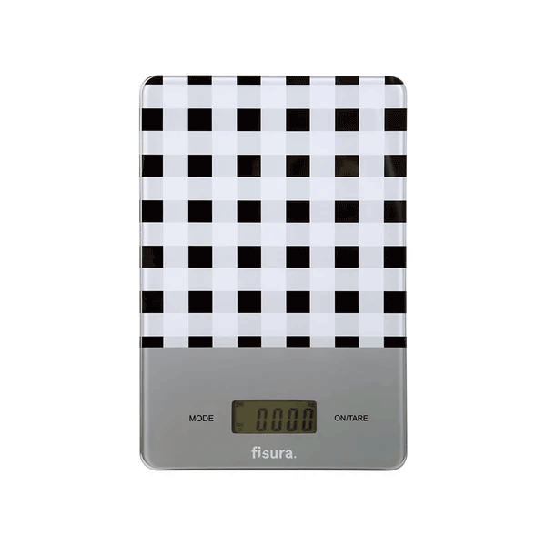 L'imprimé vichy de cette balance de cuisine nous permet de la laisser sortie et de la garder à portée de mains.