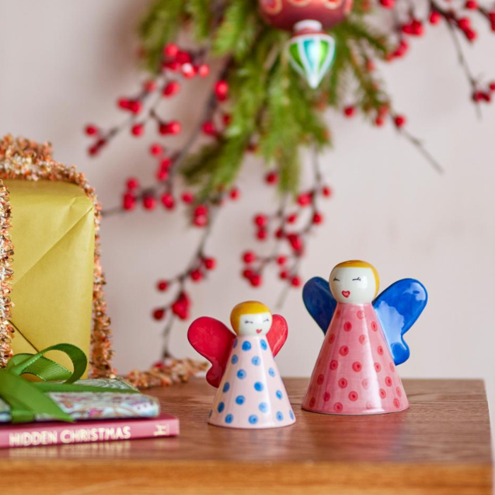 Ce petit ange en céramique peint à la main fait fondre tout le monde avec sa bouille malicieuse, sa bouche en cœur et sa chevelure moutarde. Sa robe rose à pois bleus et ses ailes rouges créent une combinaison joyeuse et pleine de caractère. Chaque pièce est unique, avec de légères variations qui ajoutent au charme artisanal. Idéal pour les fêtes, mais aussi parfait posé sur une étagère, une table basse ou une commode toute l’année.