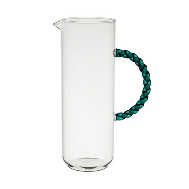 Un dîner entre amis, un brunch du dimanche, ou juste ton eau citronnée du quotidien : ce pichet en verre a tout pour devenir la star de la table. Sa silhouette fine et son bec verseur pratique se conjuguent à une anse torsadée couleur émeraude, qui lui donne un twist arty irrésistible. Sobre, mais avec juste ce qu’il faut de caractère.
