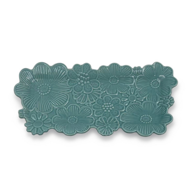 Ce plateau rectangulaire se distingue par son accumulation de fleurs délicates et ses bords irréguliers, qui lui donnent un charme artisanal unique. Avec sa couleur bleu givré, à la fois fraîche et lumineuse, il illumine nos intérieurs en un clin d'œil.