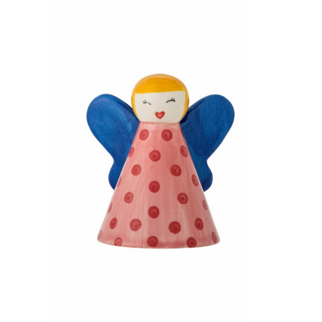 Avec sa robe rose à pois foncés, ses ailes bleues et sa petite bouille malicieuse, cet ange en céramique peint à la main apporte une vraie dose de douceur à la maison. Sa chevelure moutarde et sa bouche en cœur lui donnent un look rétro et attendrissant. Chaque pièce est unique grâce à son travail artisanal plein de personnalité. Parfait pour la déco de Noël, mais tout aussi adorable posé sur une étagère toute l’année.